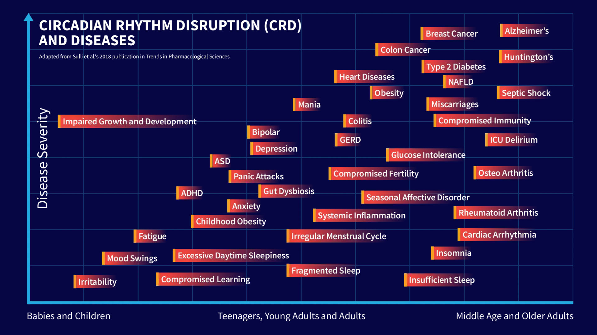 Extensive research shows that circadian rhythm disruption is linked to virtually all serious chronic diseases and many acute conditions throughout the human lifespan — ranging from mood swings and ADHD, to arthritis and alzheimer’s (1, 2, 3, 4, 5, 6, 7, 8, 9, 10, 12).
